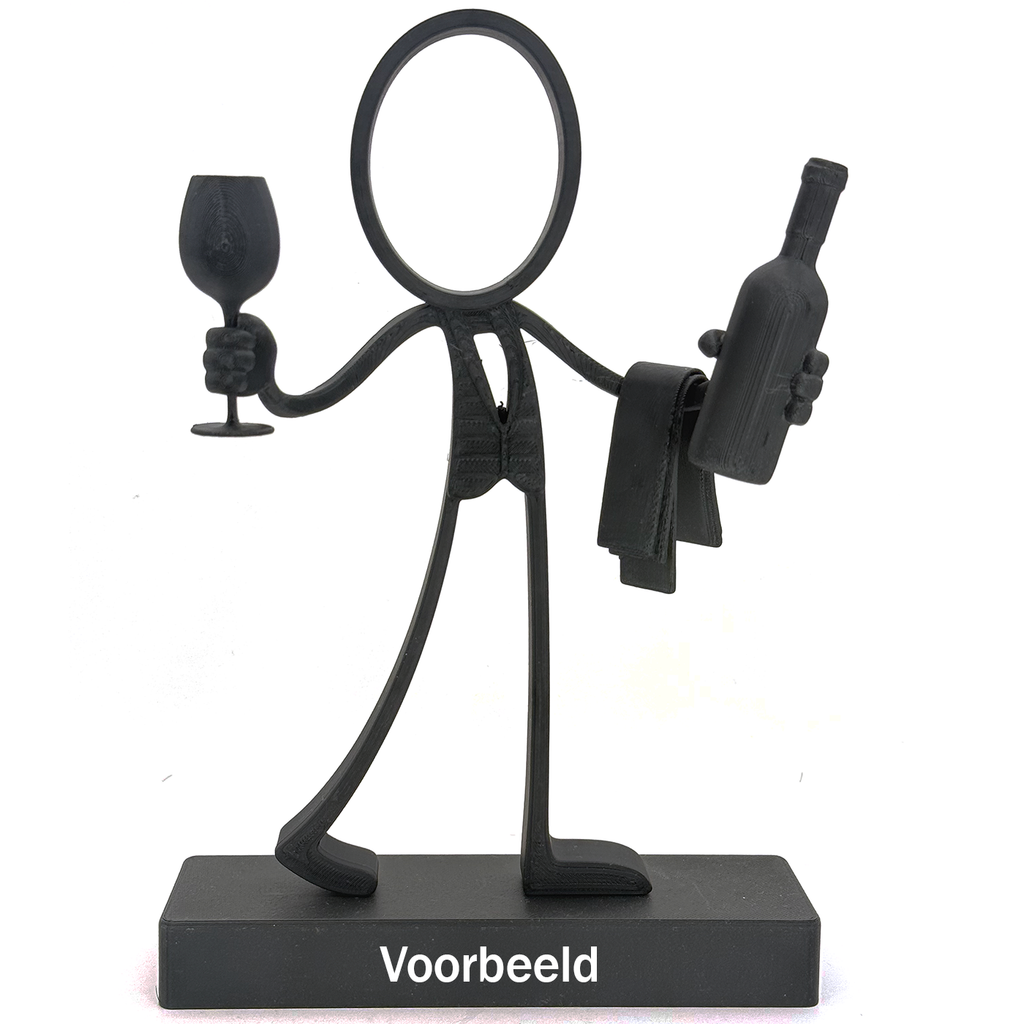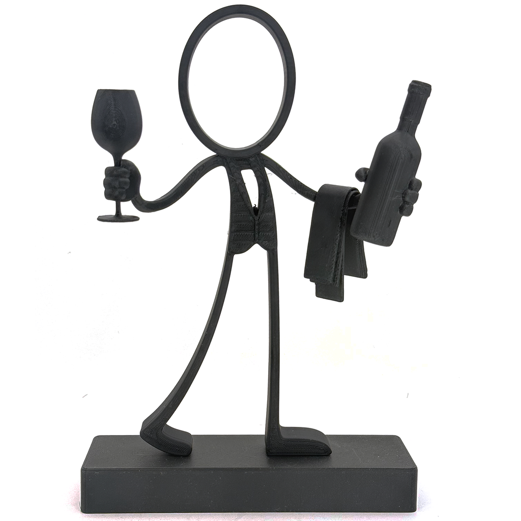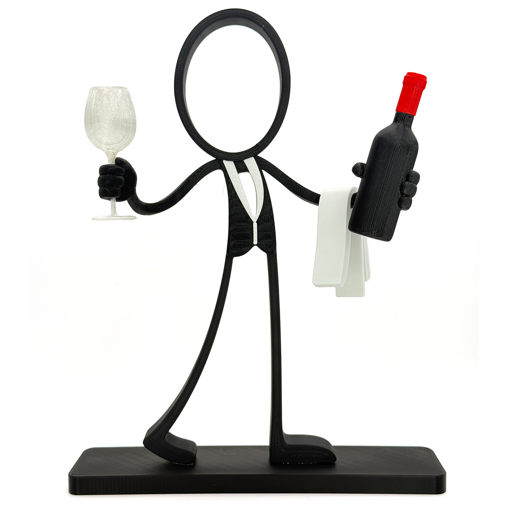 Breng sfeer, stijl en een vleugje luxe in huis met de Stickyman Sommelier. Deze moderne 3D-geprinte decoratie toont een elegante figuur met een glas wijn in de ene hand en een wijnfles met doek in de andere – klaar om te serveren.