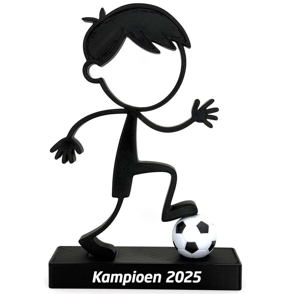 Maak dit beeldje extra persoonlijk met een voetstuk van 1 of 2 cm dik. Bij de dikkere variant kun je een persoonlijke tekst laten aanbrengen met vinylletters. Denk aan een naam, teamnaam of een korte boodschap – ideaal als blijvende herinnering aan een mooi seizoen of bijzonder moment.